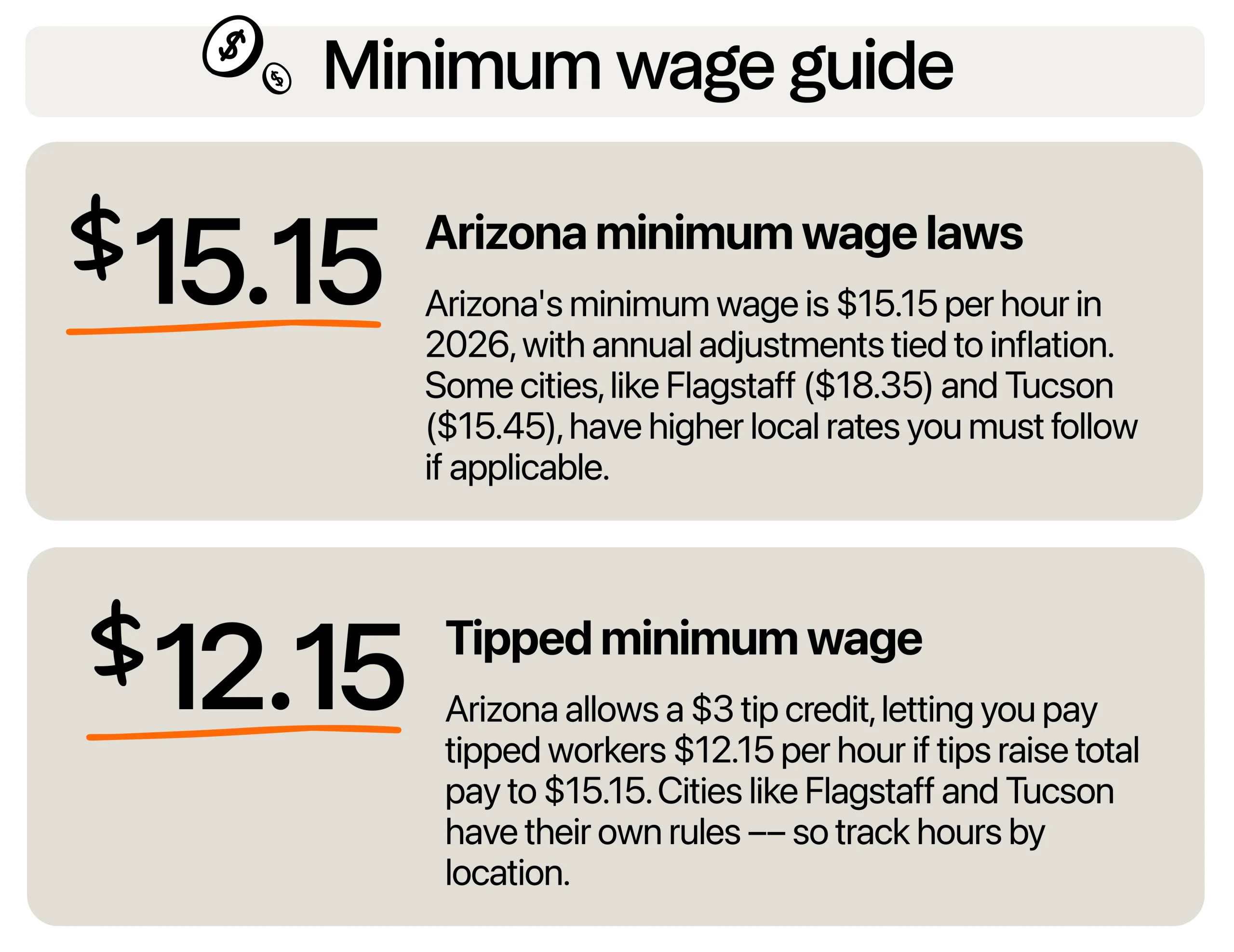 Additionally, some AZ cities even set higher local floors. For example, Flagstaff’s minimum wage is $18.35 per hour for all roles, and the tip credit was eliminated in 2026. Over in Tucson, local minimum wage is $15.45 per hour for every employee, with a $3 tip credit. If your restaurant spans city lines, you’ll need to tag shifts by location so each team member gets the correct wage rate.