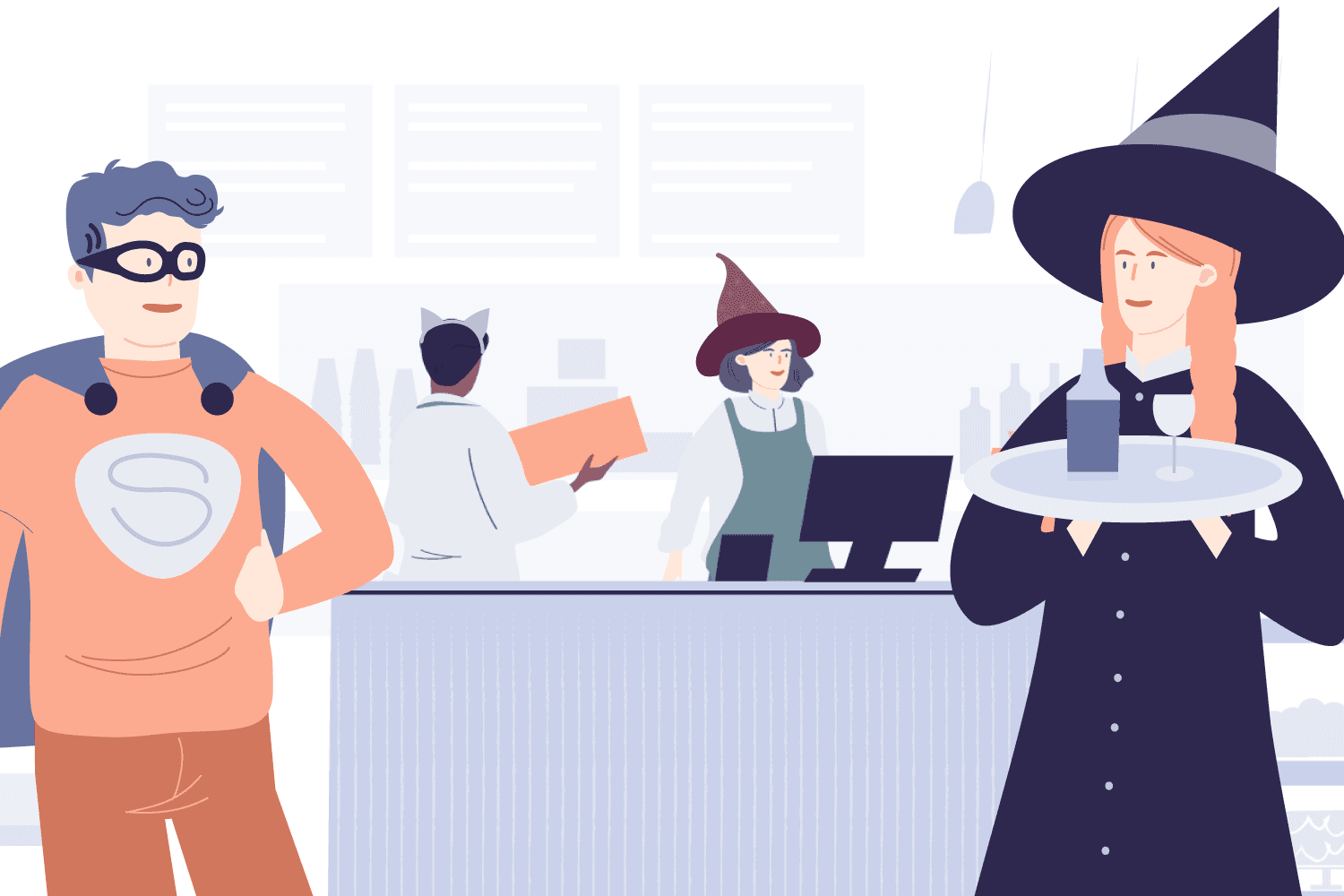 - If you work at a more casual bar or restaurant, you can go all-out with witches, ghosts, goblins, and more.