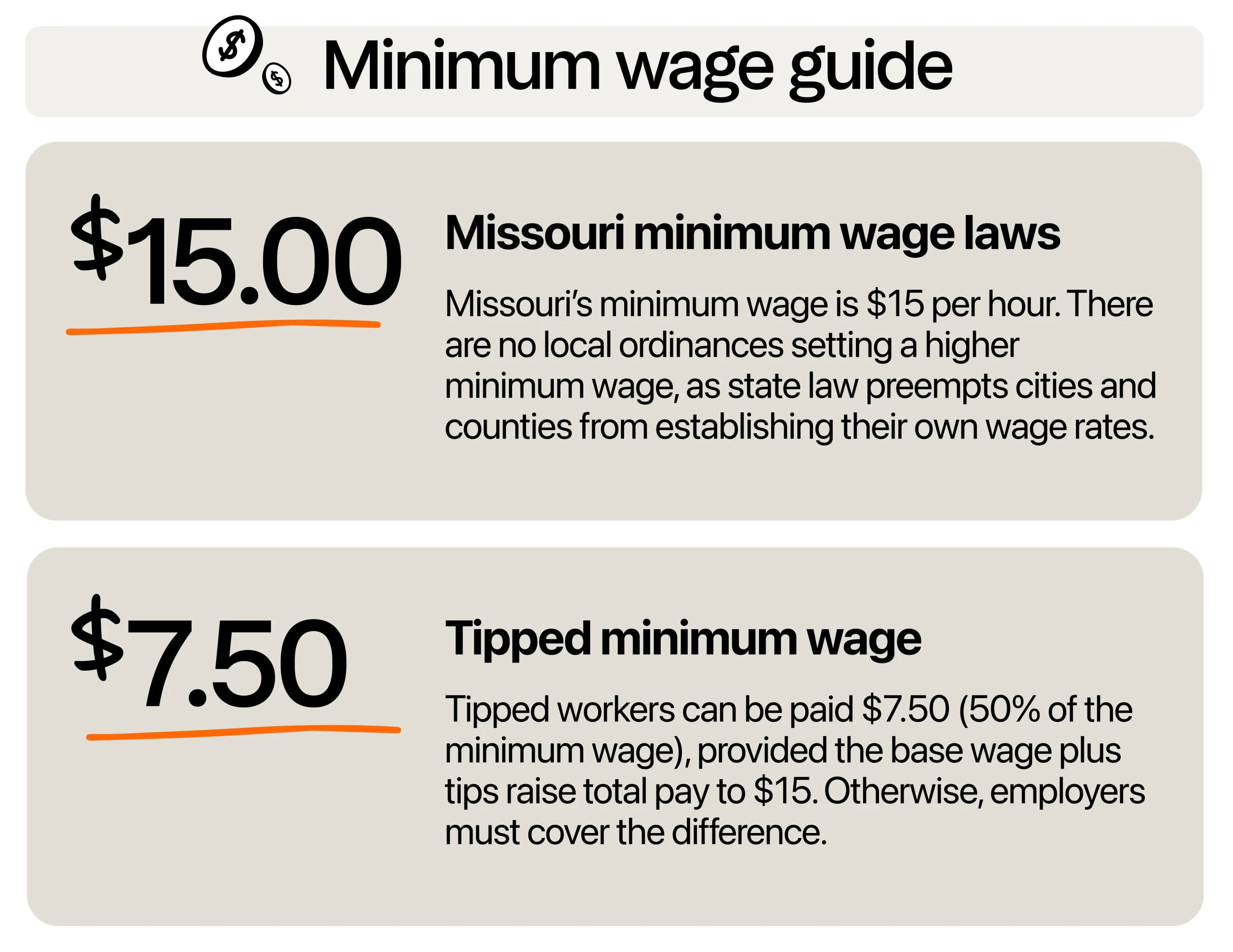 Missouri does not offer a reduced youth or training wage like some other states either. You can’t pay a lower rate to employees under 20 or new hires within their first 90 days. Everyone, regardless of age or experience level, is entitled to the same $15/hour, unless they are tipped employees under federal rules.