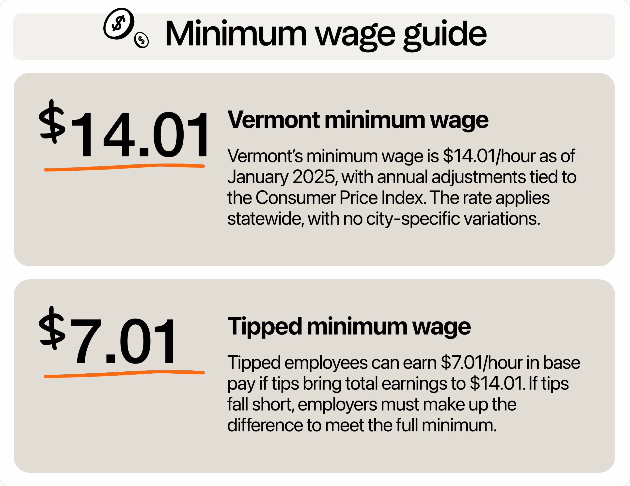 Vermont doesn’t offer a lower wage for younger or less experienced workers. Whether you’re hiring a student for the summer or bringing on someone new to the workforce, you’ll need to pay at least the full minimum wage or the applicable tipped rate. It’s a straightforward rule that helps maintain fairness across your team and simplifies your payroll planning.