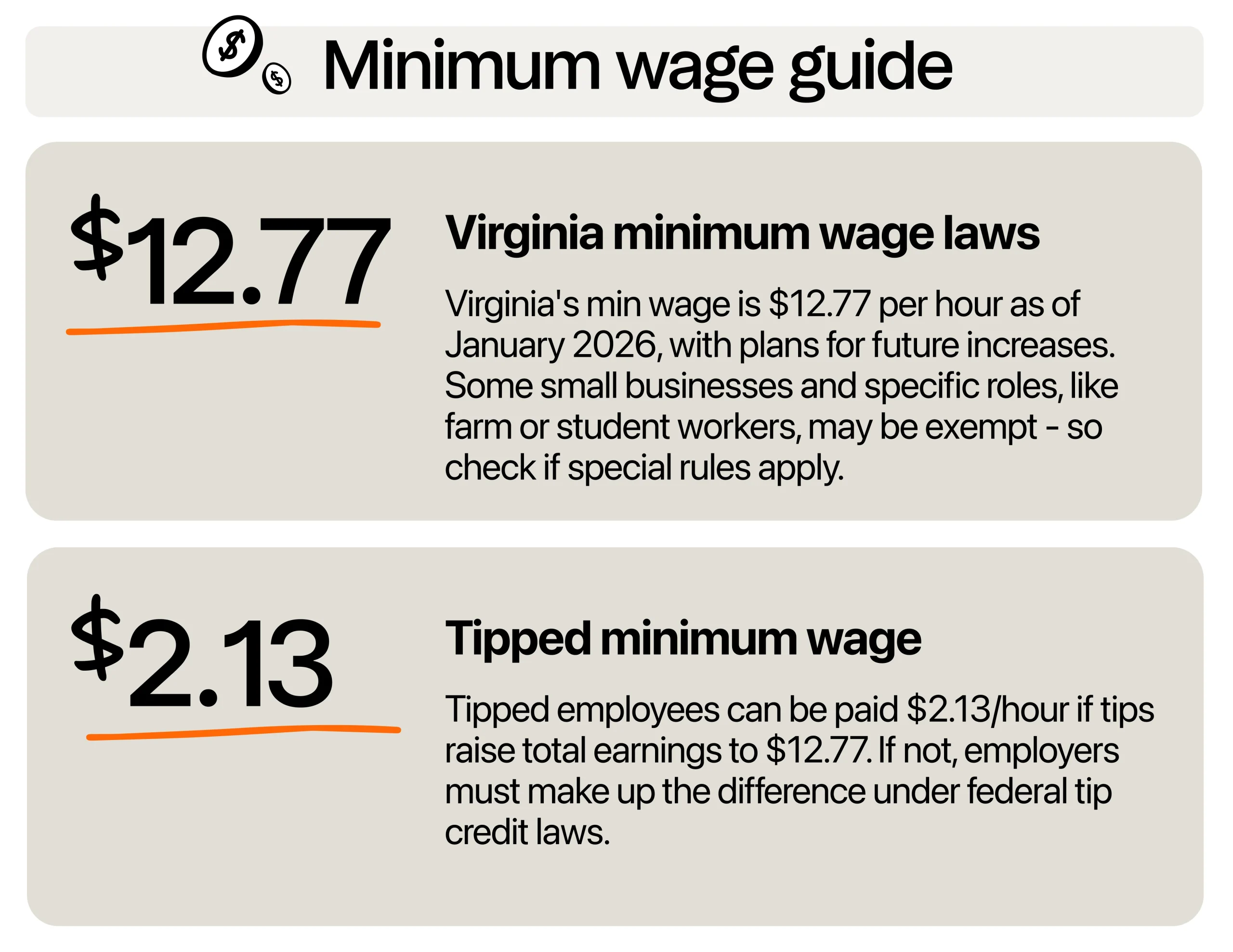The minimum wage applies to most employees in Virginia, including your hourly team members, kitchen staff, and front-of-house workers. It covers nearly all industries where hourly or non-exempt employees work.